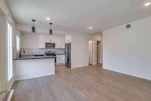 The open-concept kitchen showcases stainless steel appliances, custom quartz countertops, and modern cabinetry, flowing effortlessly into the living space. Luxury vinyl plank flooring extends throughout, complemented by plush neutral carpeting in the bedrooms.